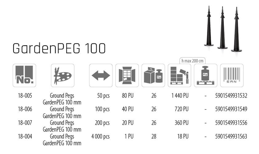 Kołki szybkiego montażu do podłoża agrotkanin, agrowłóknin, siatek na krety. Dzięki odpowiednio zaprojektowanym grotom kotwiącym przebijają mocowaną włókninę oraz utrudniają samoistne wysuwanie się kołka z gruntu. Płaska główka dociska włókninę do podłoża, zapobiegając jej podnoszeniu oraz zsuwaniu. Zastosowanie kołków GardenPEG 100 skutecznie eliminuje problem podnoszenia, trzepotania i tym samym niszczenia agrowłóknin przez podmuch wiatru. Produkt cieszy się dużym uznaniem zarówno wśród klientów hobbystycznych jak i profesjonalistów. Stosowane są najczęściej do mocowania: agrotkanin, agrowłóknin, folii, siatek itp.