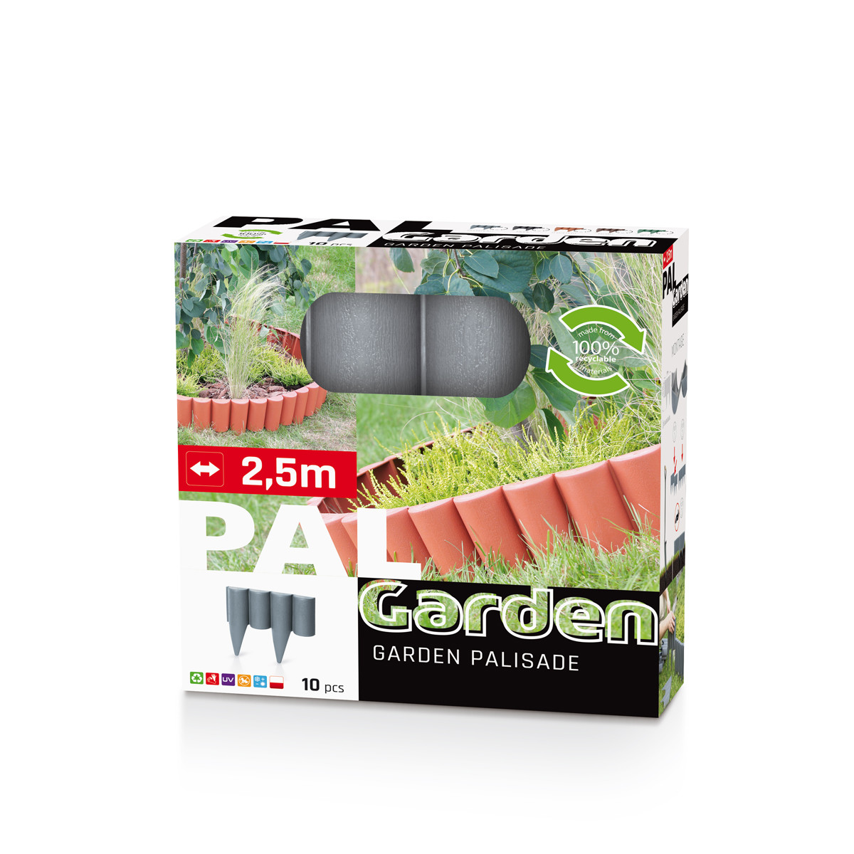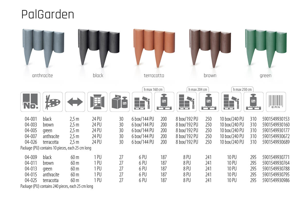 Palisada ogrodowa PalGarden, szybka i łatwa w montażu, można ją dowolnie kształtować (odcinki proste, łuki, okręgi), dzięki czemu ogród nabiera unikatowego wyglądu. Wydziela dowolne miejsca w ogrodzie, gdzie posadzone są rośliny lub usytuowane są elementy architektury ogrodowej. Imituje drewniane rolbordery, nie gnije i jest odporna na czynniki atmosferyczne.