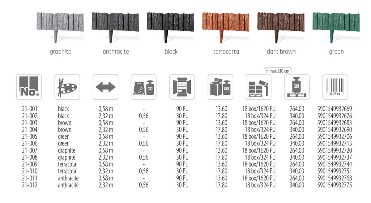 Palisada wykonana jest z elastycznego tworzywa sztucznego, odpornego na warunki atmosferyczne. Można ją dowolnie wyginać, kształtować, łączyć w odcinki proste, łuki i okręgi. Część wizualna wysoka na 130 mm, o strukturze naturalnego drewna bardzo ładnie komponuje się zarówno w małych jak i dużych ogrodach. Występuje w szerokiej palecie kolorów, dzięki czemu łatwo można dobrać kolor WOODPalisade zbliżony np. do koloru elewacji domu, ogrodzenia bądź mebli ogrodowych. Jest bardzo łatwa w montażu, można ją w każdej chwili zdemontować i zamontować w innym miejscu bez dewastacji ogrodu. W razie potrzeby można ją umyć ręcznie lub pod ciśnieniem. WOODPalisade to doskonały kompromis pomiędzy ciekawym designem, jakością i ceną. Jako jedna z nielicznych palisad wykonanych z tworzywa sztucznego, doskonale komponuje się w ogrodach urządzonych w nowoczesnym stylu z cennymi kamieniami i roślinnością.